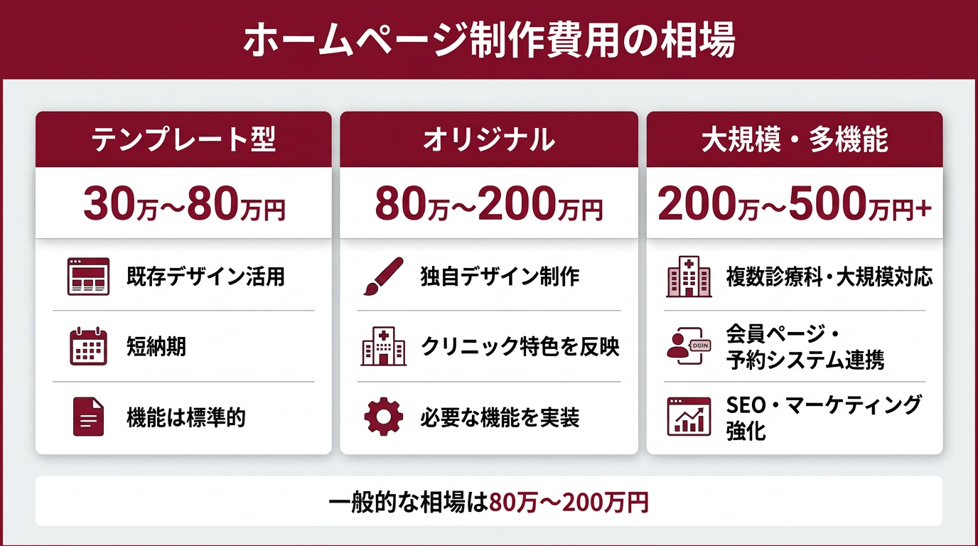 一般的なクリニック(診療科1〜2科、10ページ前後)であれば、80万〜200万円程度が相場の中心帯です。開業時は初期費用を抑えたテンプレート型で立ち上げ、軌道に乗ったらリニューアルするという段階的なアプローチも有効です。