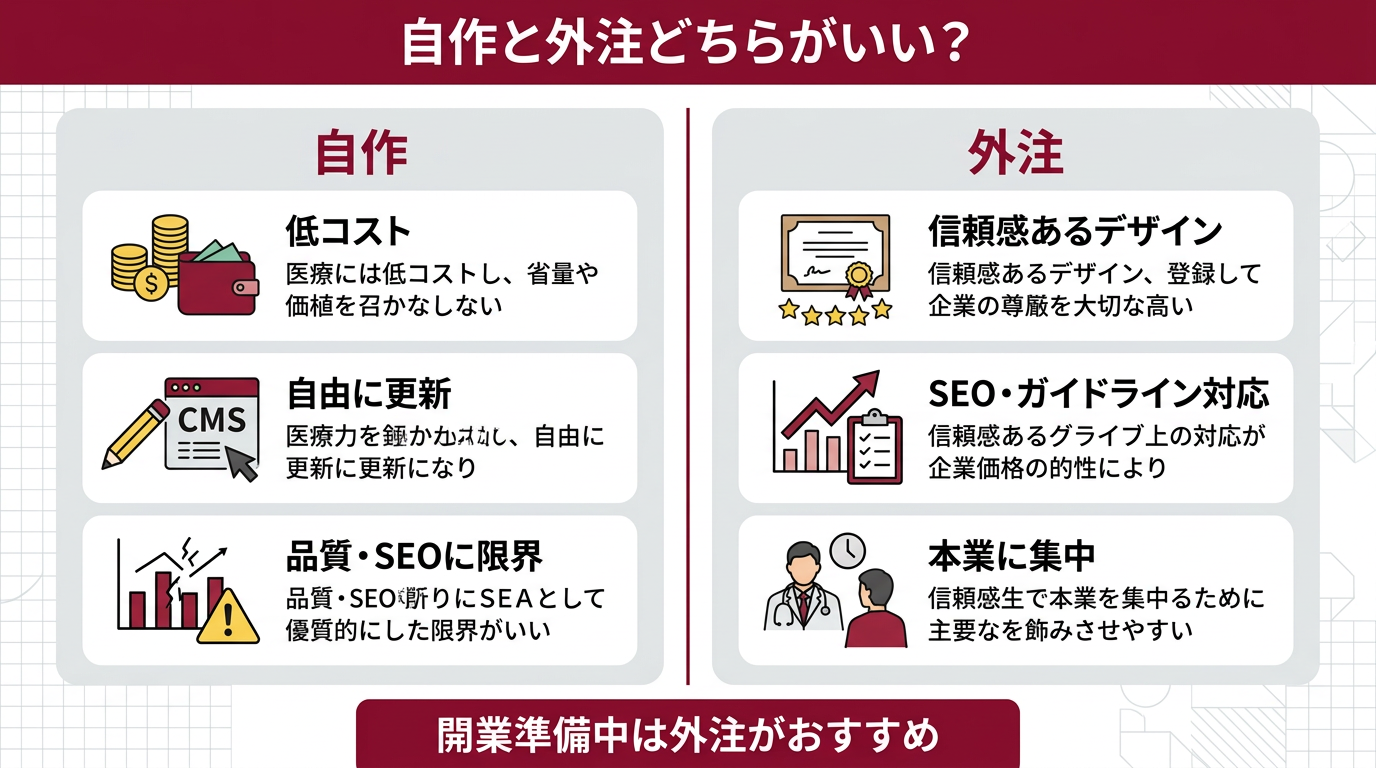 ホームページ制作の費用を抑えるために「自分で作れないか」と考える先生も少なくありません。ここでは自作と外注のメリット・デメリットを比較し、どちらが適しているか解説します。