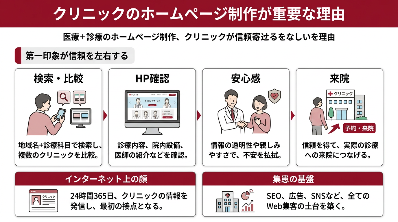 クリニックの経営において、ホームページは単なる「情報掲載の場」ではありません。患者が来院を決める最大の判断材料であり、集患の成否を左右する重要な経営ツールです。
