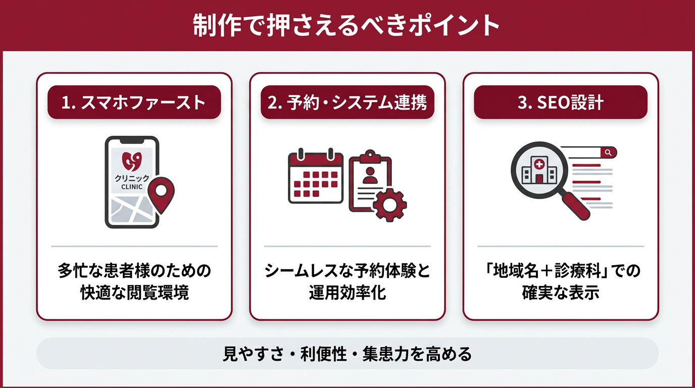 ・ページ数を絞る:まずは必要最低限のページ(トップ・診療案内・医師紹介・アクセス・予約)で公開し、段階的に拡充する方法がコスト効率に優れています
