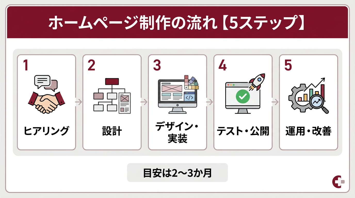 クリニックのホームページ制作は、一般的に以下の5ステップで進みます。全体のスケジュールは2〜3ヶ月程度が目安です。各ステップで何が行われるかを把握しておきましょう。