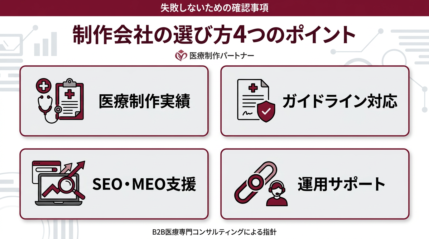 クリニックのホームページ制作会社は数多く存在しますが、どこに依頼しても同じ成果が得られるわけではありません。以下の4つのポイントを基準に選ぶことで、失敗のリスクを大幅に減らせます。