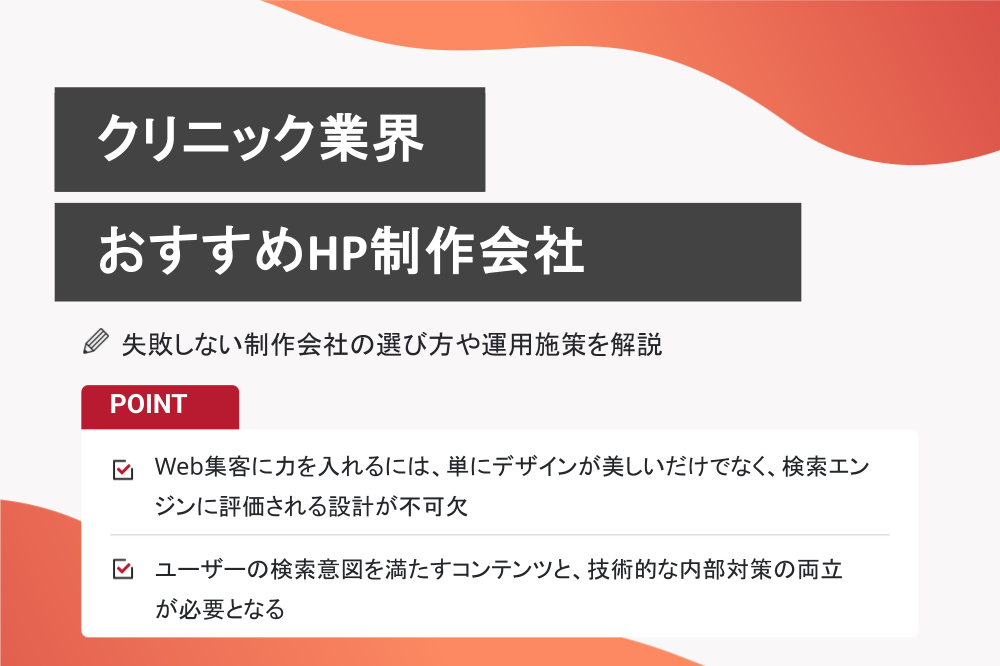 クリニックのホームページは、患者との最初の接点であり、集患・増患を左右する重要な経営ツールです。制作会社を選ぶ際は、医療業界の実績・医療広告ガイドラインへの対応力・SEOなどの集患支援・公開後の運用サポートの4つのポイントを軸に比較検討しましょう。