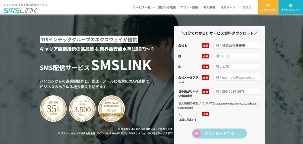 SMSLINKのLPは、SaaSらしい「課題解決型構成」と「数値で裏付ける信頼設計」が特徴です。