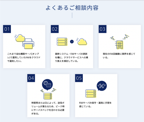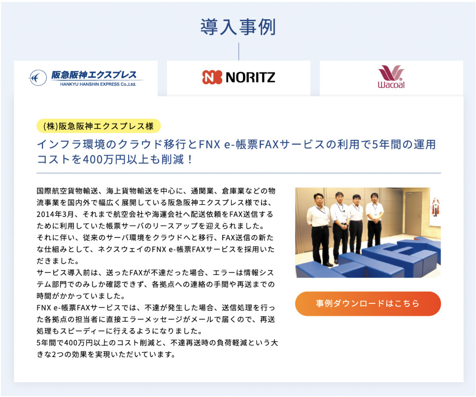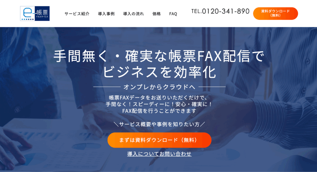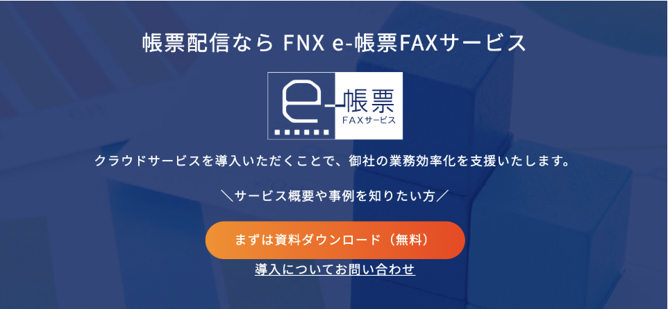 FNX e-帳票FAXサービスのLPは、「手間なく・確実に帳票を配信できる」という明確な価値訴求が中心です。オンプレ環境のFAX運用課題を示し、クラウド化による「業務効率化」と「コスト削減」を具体的に伝えています。