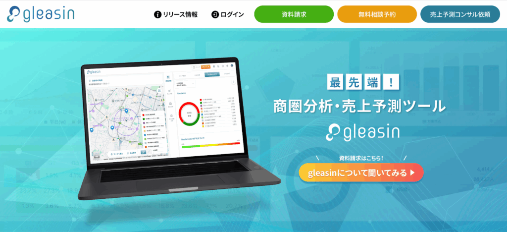 gleasinのLPは、立地戦略に特化したSaaSとして「商圏分析・売上予測ツール」を明快に訴求しています。ファーストビューで「マップにピンを落とすだけで立地データを5秒で算出」と具体的な体験価値を提示し、直感的理解を促します。