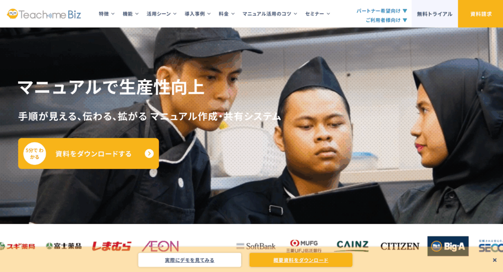 Teachme BizのLPは、「手順が見える、伝わる、拡がる」というキャッチで、業務マニュアル共有の価値を直感的に伝えています。導入企業ロゴを多数配置し、信頼性を即時に訴求。課題提示から「マニュアル化による生産性向上」へと自然に導くストーリー構成です。