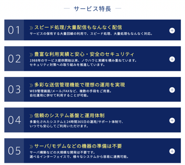 サービスの特徴として、年間数億枚規模の大量配信能力、24時間365日のサポート体制、SaaS安全認証などの高い信頼性を強調。さらに、導入相談から資料請求まで複数のCTAを配置し、導入検討段階の企業をスムーズに行動へ導く構成です。