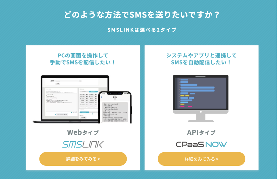 ファーストビューでは「キャリア直接接続による高品質SMSを業界最安値水準1通6円〜」と明示し、導入のメリットを即座に理解できる設計になっています。さらに、電話不通やメール未達といった企業の共通課題を提示し、「PCからの手動送信」と「API連携による自動化」という2タイプの解決策を整理しています。