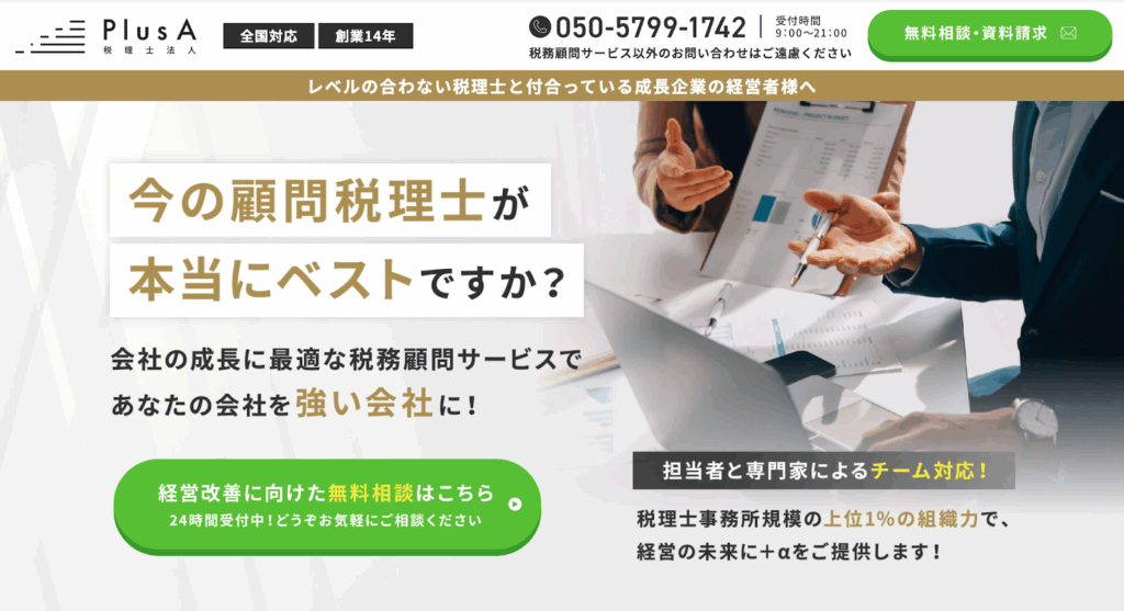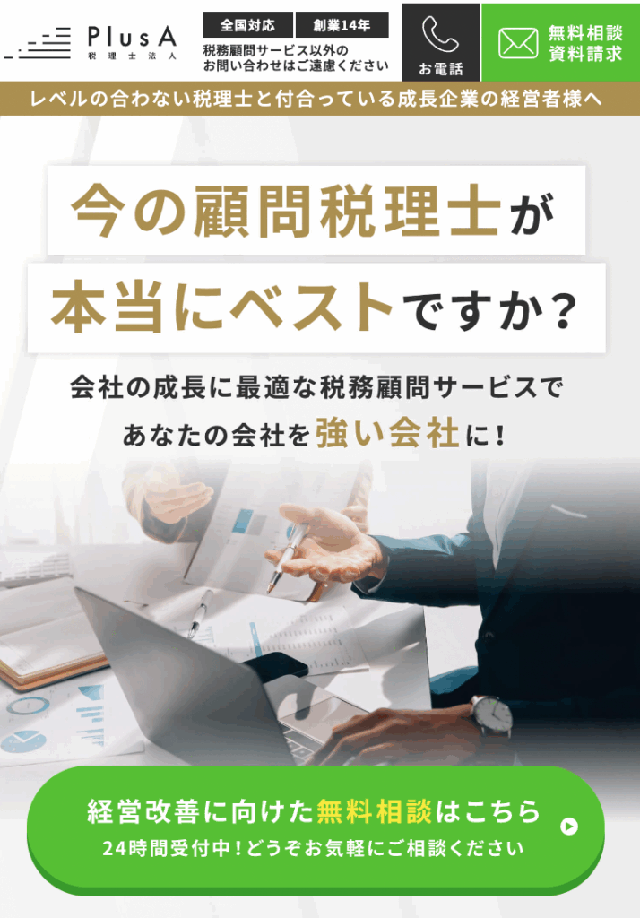 PlusA税理士法人のLPは、成長企業を対象に「今の顧問税理士が本当にベストですか?」という問いかけから始まり、顧問切り替えを検討させる構成です。