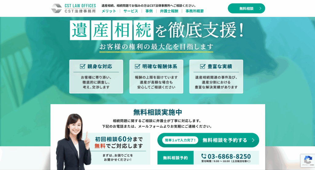 CST法律事務所の相続LPは「初回相談60分無料」という案内を冒頭に掲げ、相談のハードルを下げています。