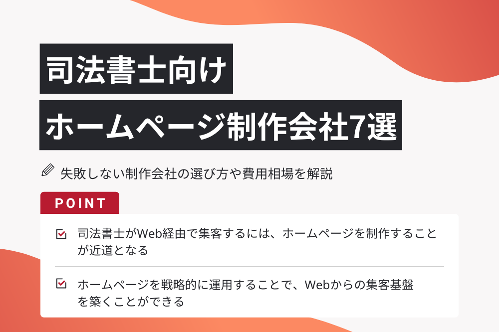 本記事では、司法書士にホームページが必要な理由やおすすめの制作会社7選を厳選してご紹介します。失敗しないための選び方や費用相場もあわせて解説しますので、ぜひ最後までお読みください。